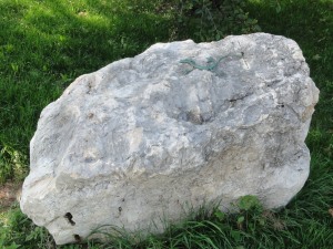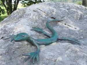 Auf einem großen Findling (einzeln liegender großer Stein) neben der Kapelle sitzt eine kunstgeschmiedete Eidechse. |