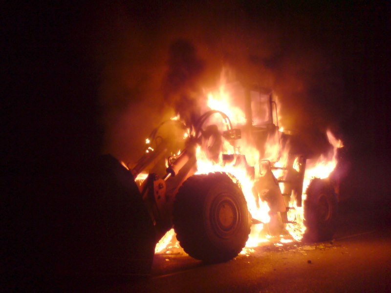 27. Juni 2011 Radladerbrand Um 23.09 Uhr wurden wir zu einem Radladerbrand auf der B465 gerufen. Laut Polizei Ehingen brach während der Fahrt, kurz vor Altsteußlingen, die Kardanwelle. Diese beschädigte einen Hydraulikschlauch. Das auslaufende Hydrauliköl fing sofort Feuer. Der Radlader brannte vollständig aus, auch der Straßenbelag nahm Schaden. Der Schaden wird auf ca. 30.000 EUR geschätzt. |