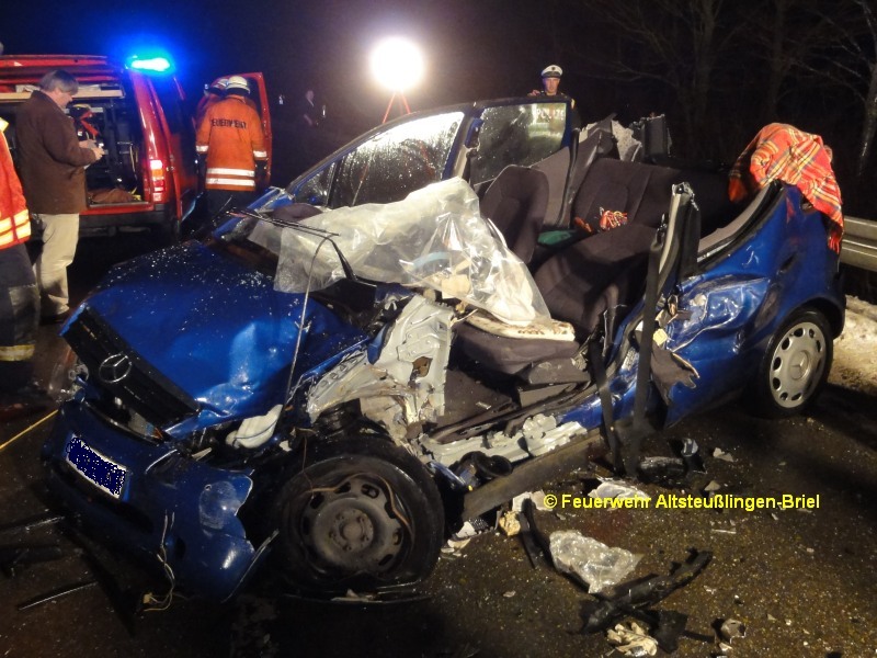 22. Dezember 2011 VU zwischen Altsteußlingen und Briel Zu einem schweren Verkehrsunfall auf der Kreisstraße zwischen Altsteußlingen und Briel wurden um 17.08 Uhr die Tagschleife Alb und die Stützpunkwehr Ehingen alarmiert. Eine Mercedes A-Klasse-Fahrerin kam auf der Fahrt zwischen Altsteußlingen und Briel auf die Gegenfahrbahn, und prallte dort mit einem entgegenkommenden Traktor mit Schneeräumschild zusammen. Die Feuerwehr musste die verletzte Person aus dem Auto herausschneiden. Neben der Personenrettung übernahm die Feuerwehr auch die Absicherung der Einsatzstelle. Aus Altsteußlingen waren 5 Kameraden im Einsatz. |