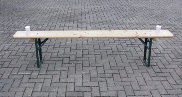 einer Biertischgarnitur, auf der an beiden Enden ein mit Bier