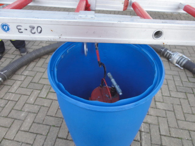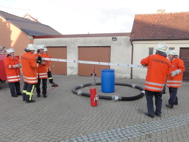 Eine Kübelspritze muss aus einem Fass geholt und außerhalb des Ringes