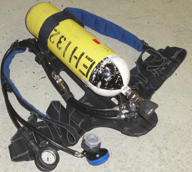 Hier abgebildet ist ein so genanntes Einflaschen-Gerät. Die Stahlflasche hat ein Volumen vom 6 Litern (ca. 1600 l Atemluft) bei 300 bar Fülldruck.