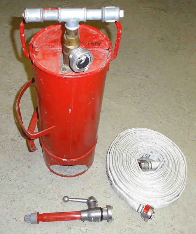 Die Kübelspritze gehört zu den Kleinlöschgeräten und sieht möglicherweise etwas altmodisch aus. Aufgrund der Wendigkeit und des schnellen Einsatzes wird die Kübelspritze aber bei Kleinfeuern oder bei Nachlöscharbeiten häufig eingesetzt. Sie besteht aus einem Metalleimer (Kübel) mit 10 Litern Fassungsvermögen und einer darauf fest angebrachten Handpumpe. Angeschlossen wird an die Pumpe ein D-Schlauch mit einem D-Rohr. Über einen Deckel an der Oberseite kann die Kübelspritze befüllt werden. Bedient wird das Gerät von zwei Personen: eine Person pumpt am oberen Hebel und die andere Person hält den Schlauch und löscht. |