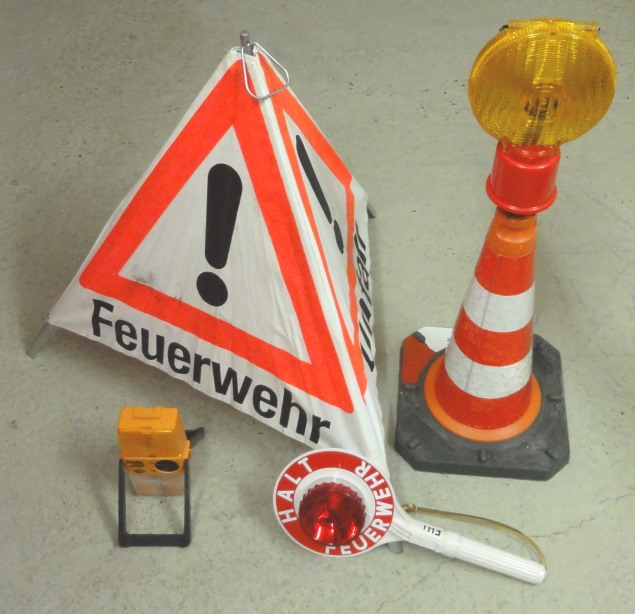 Oftmals muss die Einsatzstelle vom fließenden Verkehr abgesichert werden. Hierzu haben wir Verkehrsleitkegel, Blitzlampen, Faltsignale und ähnliches auf unserem Fahrzeug dabei.